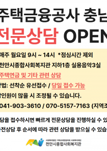 무엇이든 물어보살!! 주택연금편한국주택금융공사 전문상담이 천안시종합사회복지관에서 진행됩니다. 매주 월..