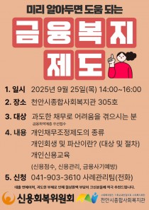 천안시종합사회복지관에서 금융복지제도에 대한 교육을 진행합니다. 과도한 채무, 대출연체이력이 있으신 분..