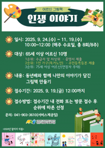 어르신 그림책[인생이야기] 참여자 모집- 일시: 2025. 9. 24.(수) ~ 11. 19.(수) 매주..