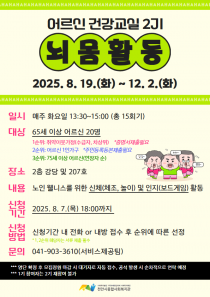 노인의 웰니스를 위한 신체 및 인지 활동 어르신 건강교실[뇌몸활동] 2기 참여자를 모집합니다.- 일시: 2025...