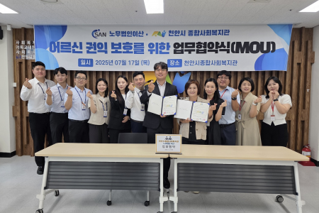 천안시종합사회복지관(관장 문명희)은 17일 노무법인 이산(대표 김명환)과 어르신과 지역주민의 권익보호를..